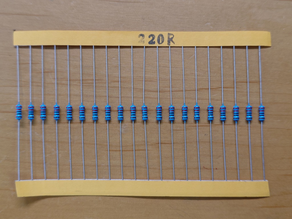 今回は「赤・赤・黒・黒・茶」を使います。赤(2)・赤(2)・黒(0)→ここまでで220・黒(×1)→ここで220Ω・茶(許容差1%)となります。220Ωなので前回の10倍です。