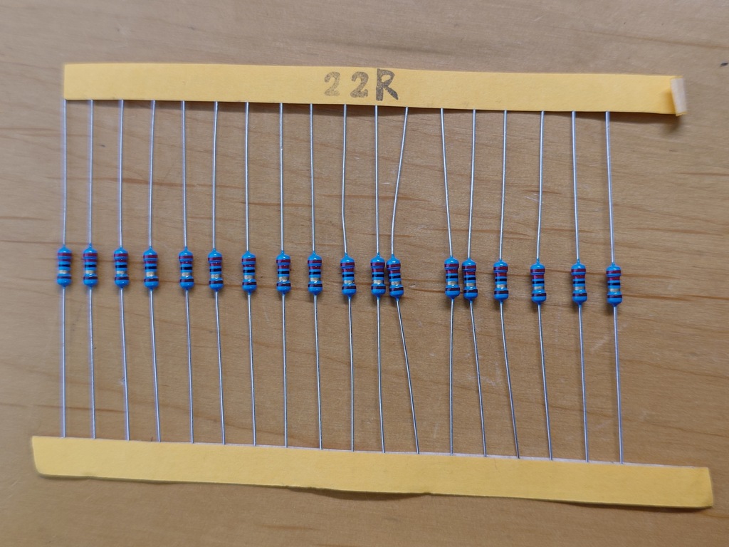 前回は「赤・赤・黒・金・茶」となっていて、赤(2)・赤(2)・黒(0)→ここまでで220・金(×0.1)→ここで22Ω・茶(許容差1%)となります。
