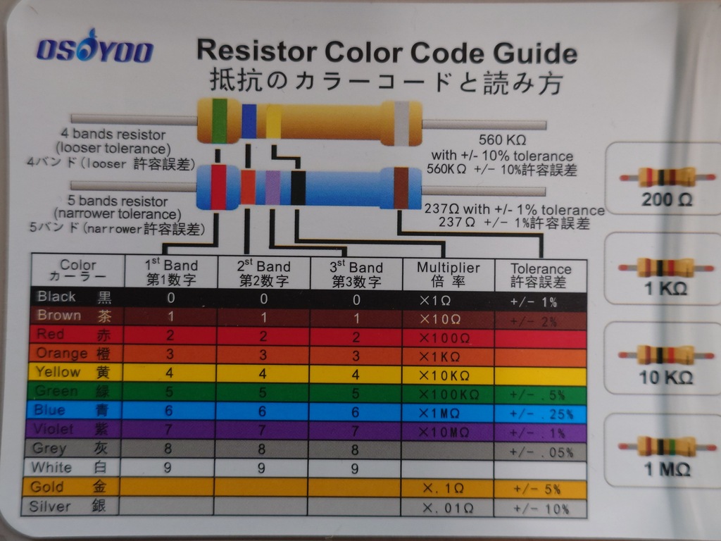 抵抗値を10倍くらいに変更しようと思います。改めて見てみたら、抵抗にはカラーバーが5本書かれています。これってどういう意味なのでしょうか。