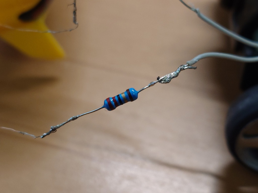 念のためLEDそれぞれに抵抗を挟んでから並列に接続します。抵抗を挟んだりしたので、リード線(AW28)をかましましたが、抵抗を入れなければ直接基板にハンダ付けをしても良いかもしれません。抵抗値は小学校か中学校で習ったオームの法則により決定しますが、計算方法は他のサイトにお任せしようと思います。