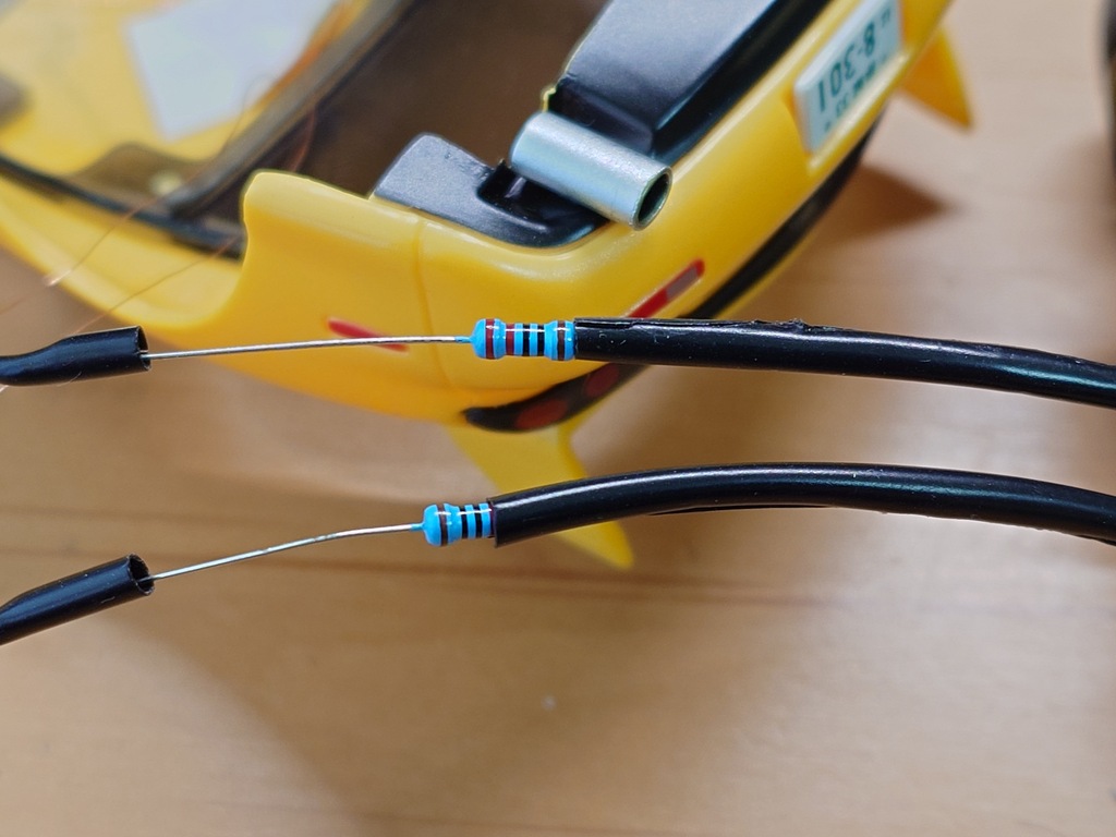 そして完成です!電源から直接取ったのでハンドルを切ったり、モーターの負荷を上げてしまうとLEDが一気に暗くなりますが、これはご愛嬌ということで・・・。子供も大満足です!なお、このLEDめちゃくちゃ明るくて眩しいくらいです。抵抗はもっと大きくても良いかもしれません。